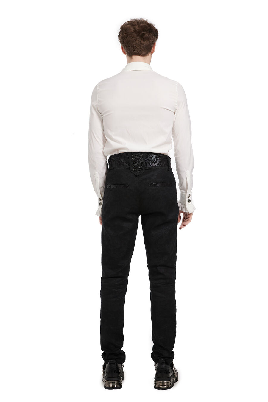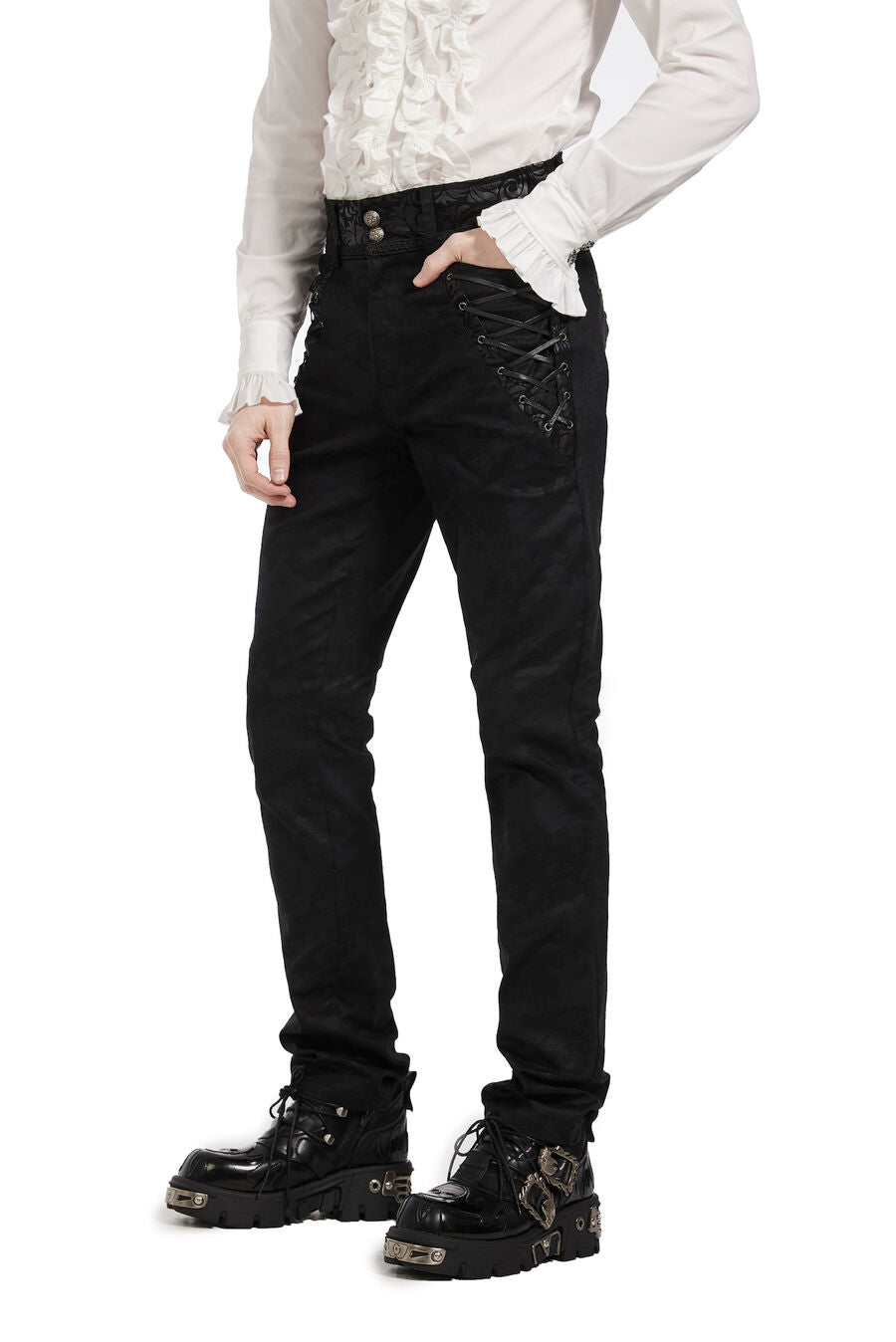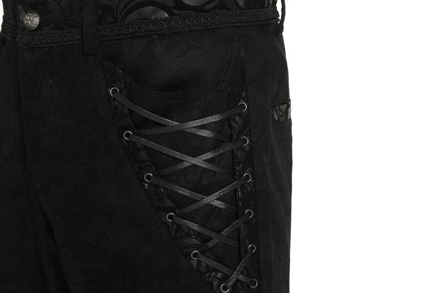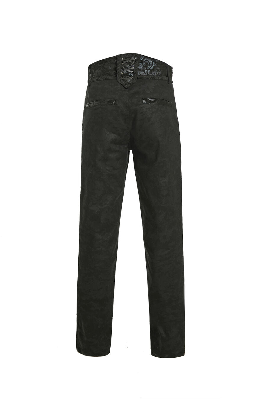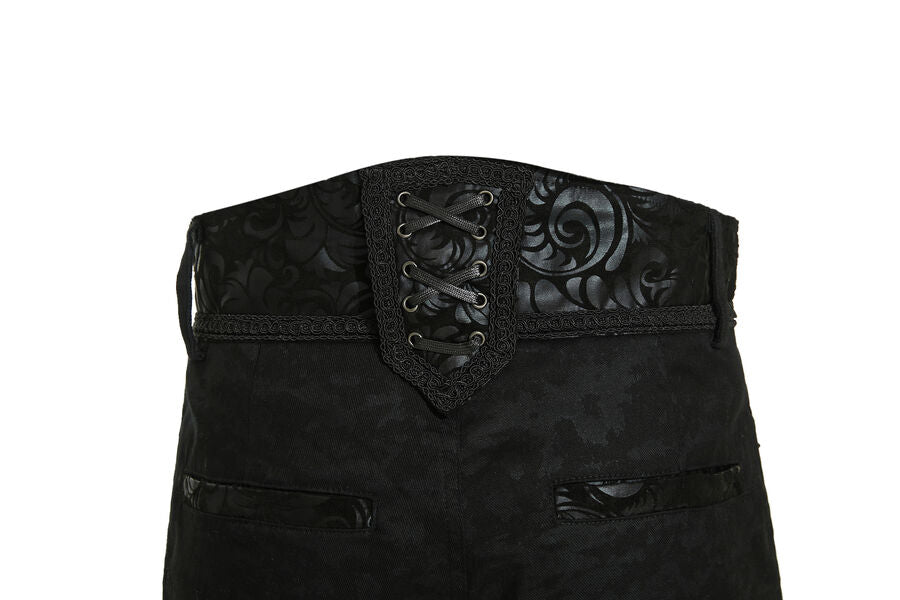 Pantalon aristocrate pour homme avec du simili cuir floqué et des motif en arabesques, des boutons argentés, ainsi que de 2 poches devant et 2 autres derrière. Idéal avec une chemise à jabot et une veste.