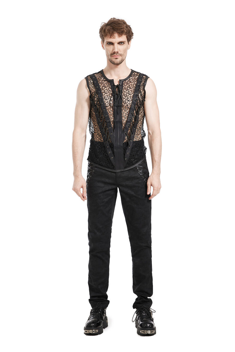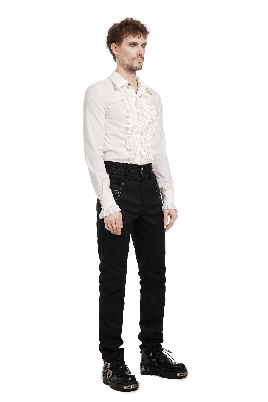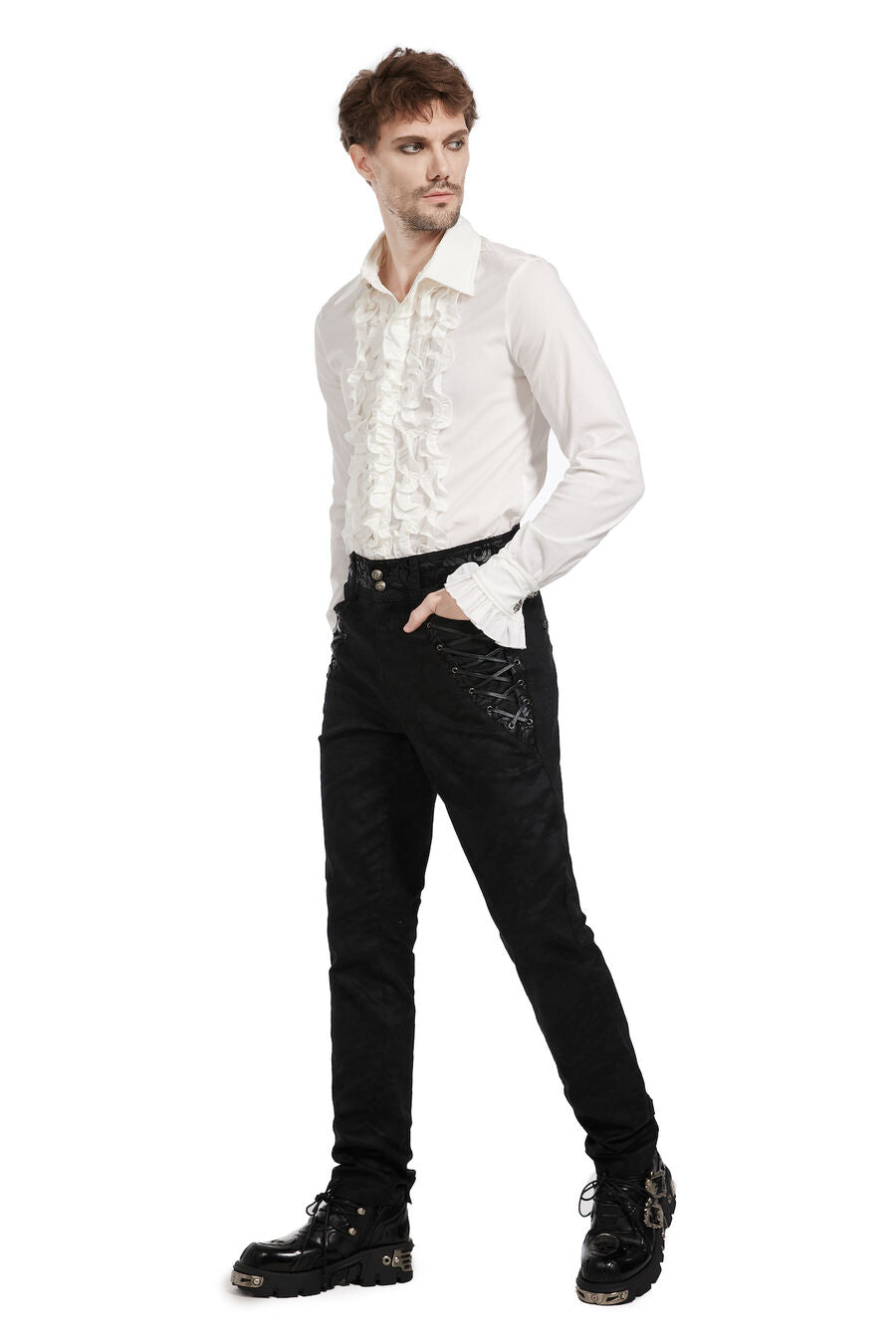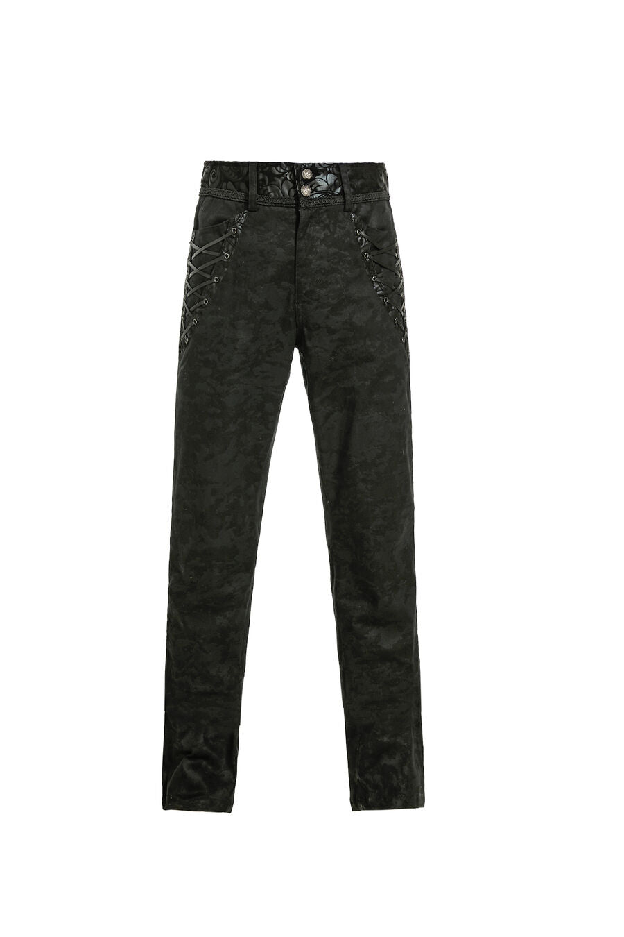 Pantalon aristocrate pour homme avec du simili cuir floqué et des motif en arabesques, des boutons argentés, ainsi que de 2 poches devant et 2 autres derrière. Idéal avec une chemise à jabot et une veste.